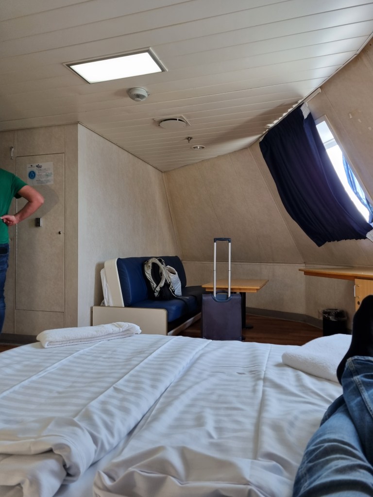 I infon aktiverade vi våra hyttnycklar. En överraskning var att hytten låg längst fram i fören, mer än jag visste vid bokningen. Eftersom resan är över 9 timmar lång kostade vi på oss en rymlig hytt.