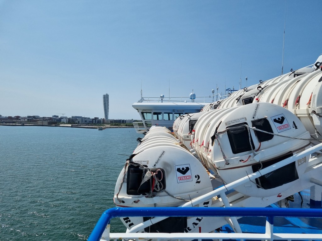 En tur på däck innan avgång. Turning Torso twistar sig mot himlen.