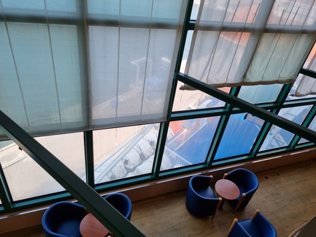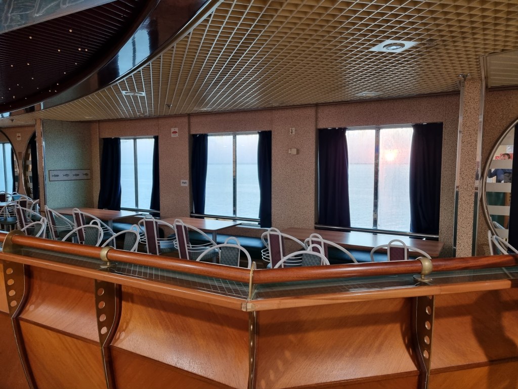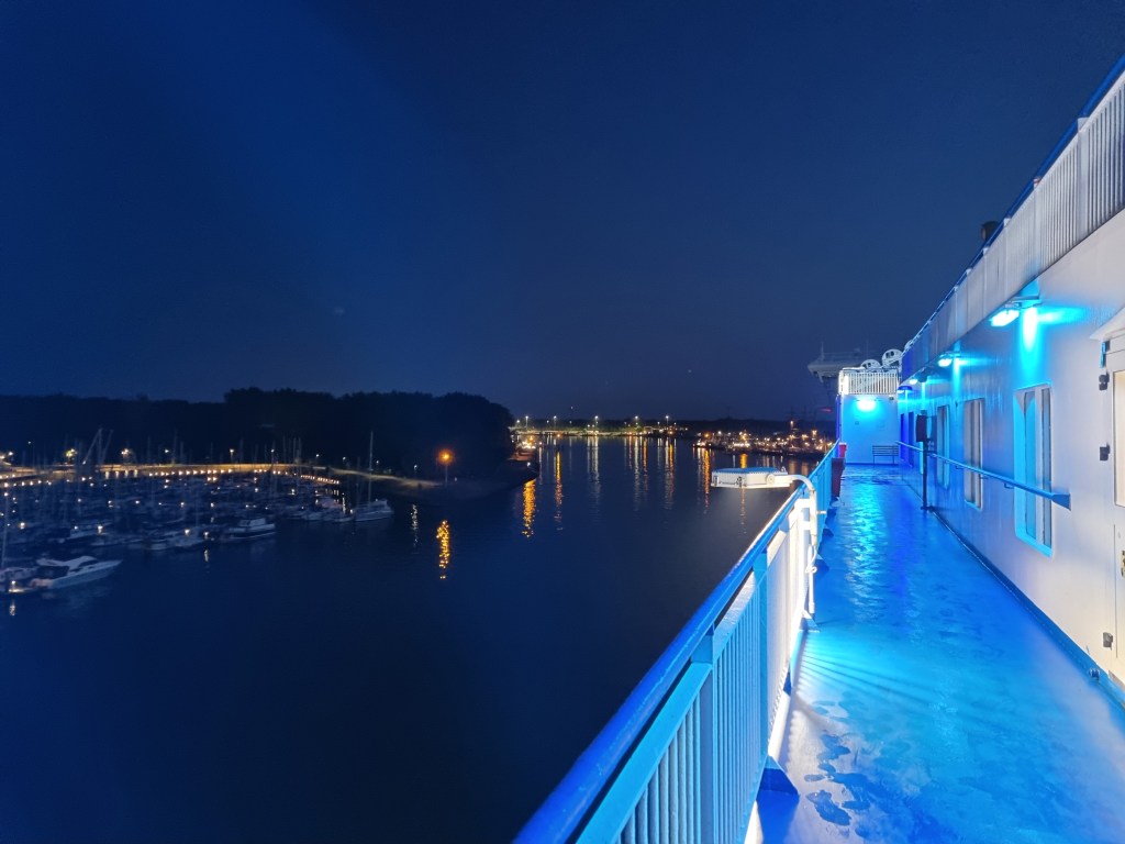 Jag hade det bra ombord på Cruise Smeralda. Det gick smidigt från incheckning till att vi blev avsläppta av en trevlig hamnpersonal vid tåghållplatsen i Travemünde. Ska man TILL färjan finns inte den möjligheten, utan man måste då ta sig med stadsbuss eller taxi till terminalbyggnaden som fotpassagerare. Osäker på hur det fungerar om det är gräns- eller tullkontroll för ankommande färjeresenärer, om man då måste åka till terminalen istället för tågstationen. Att vara på Cruise Smeralda är en retroresa till 90-talet. Redigt sliten invändigt där rederiet kort och gott struntat i löpande underhåll. Grejer som hänger löst, igengrodda fönster, gott om skruvhål, avloppslukt i hyttkorridorer, med mera. Möblerna var i alla fall hela och lakanen i hytten rena. Besättningen var mestadels italiensk, med svenskspråkig personal i informationen. Serviceinriktat i allmänhet.