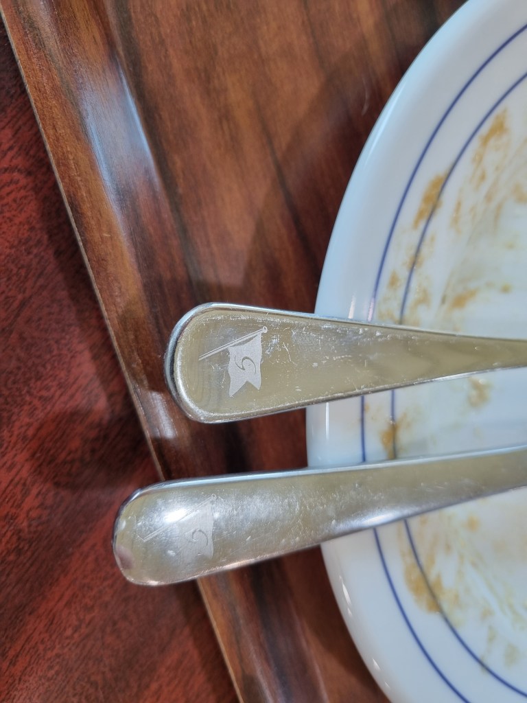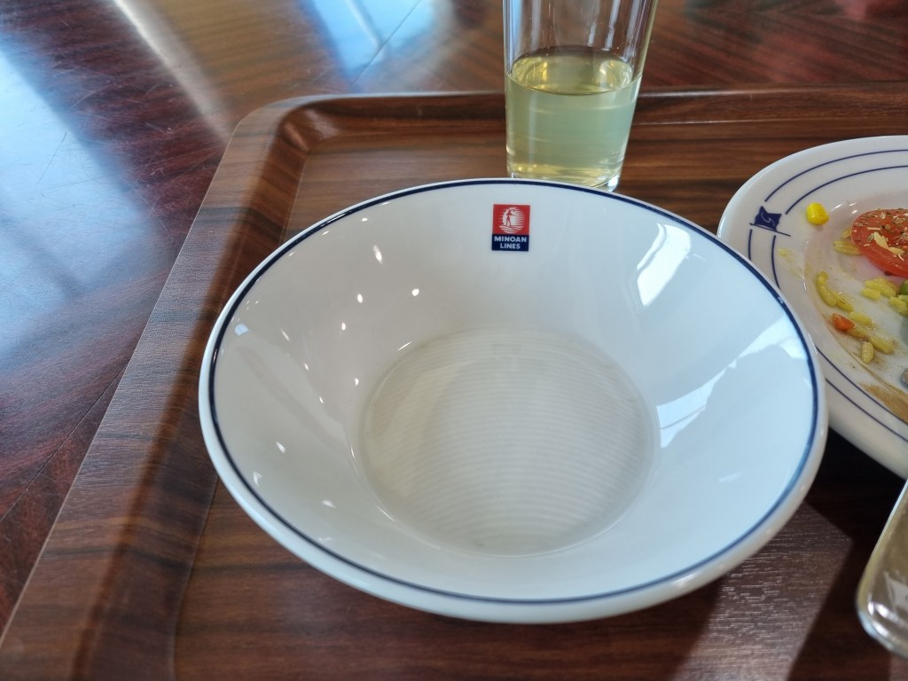 Cruise Smeralda hette tidigare Ikarus, senare Ikarus Palace. Då i trafik för Minoan Lines vars logga fått dekorera porslinet. Lägg märke till Grimaldis logga på den flata tallriken.