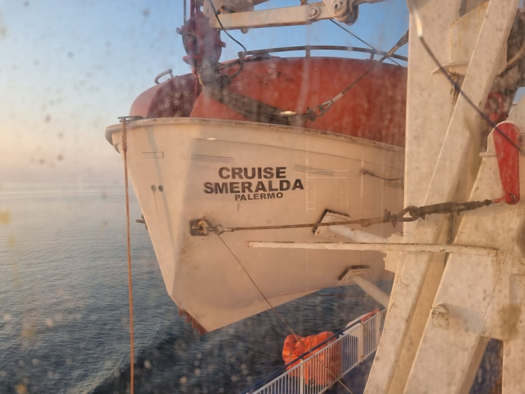 Till havs hade besättningen övning enligt krav som italienska myndigheter ställer. Tidpunkten för övningen och huruvida passagerarna skulle bli inblandade rådde viss förvirring kring. Så småningom kom den igång med simulerad brandsläckning, verklighetstrogna utrop, omhändertagande av sårade och fiktiv evakuering av hytter. ”Evakuerade” hytter markerades med dasspapper på dörrhandtaget. Två utrullade brandslangar ute på däck pekandes i vår riktning fick oss att ta beslutet att gå in för att säkra torra kläder 😉