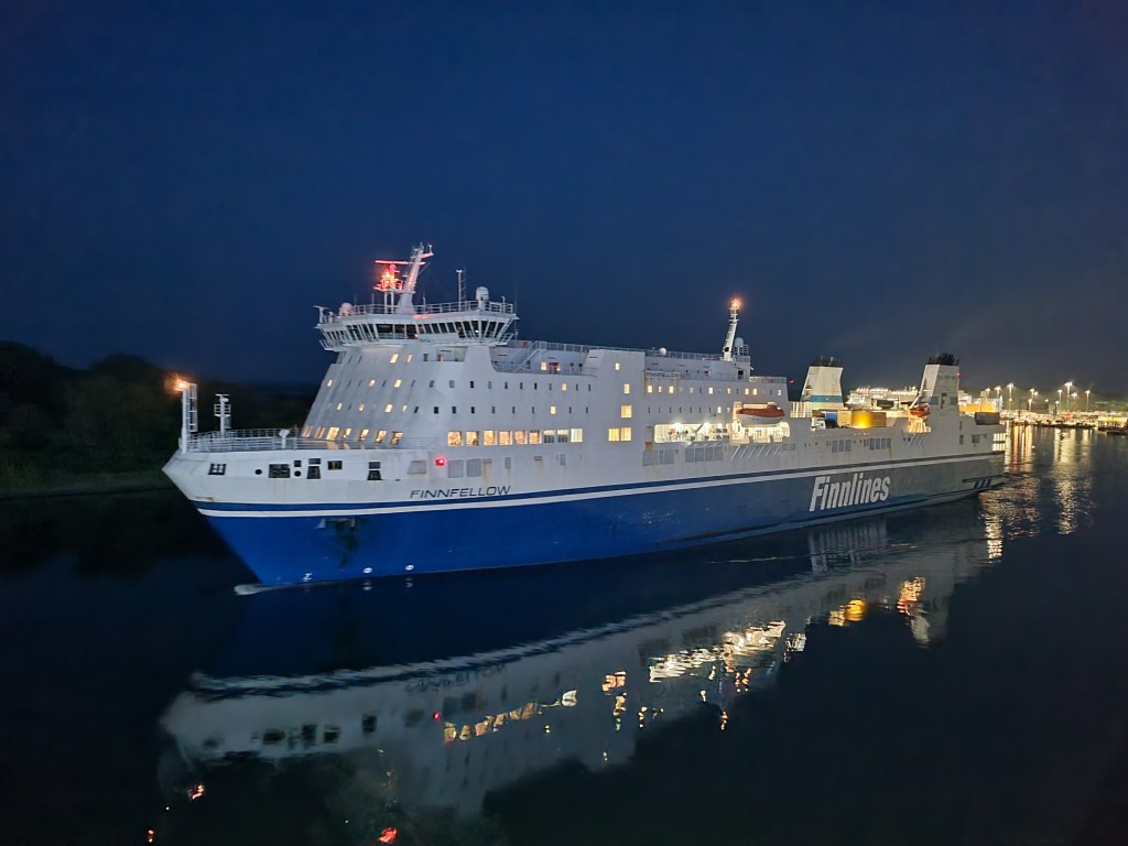 Finnfellow, det tredje fartyget på linjen mellan Travemünde och Malmö, har just påbörjat sin nattsegling mot Sverige.