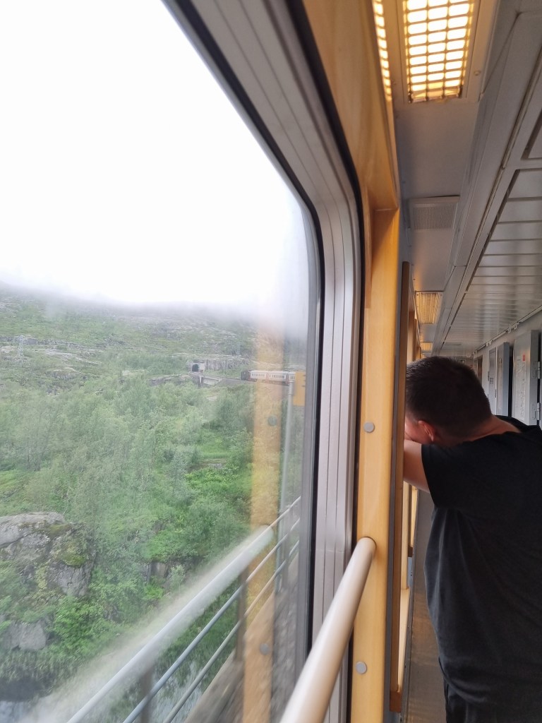 Björn spanar framåt i tåget som snirklar ganska ordentligt på norska sidan. Sittvagnar hade kopplats på i Boden samtidigt som andra vagnar kopplats av för färd mot Luleå.