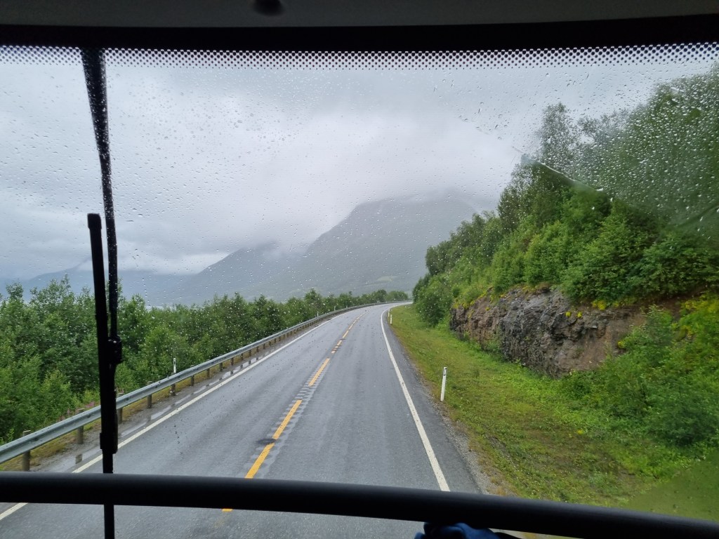 Finns det ingen järnväg så får det bli buss. Länstrafiken mellan Narvik och Tromsö tar ungefär 4 timmar. En mycket stor andel husbilar och andra semesterekipage. Annars hade vi varit ganska ensamma om E6:an som detta är.