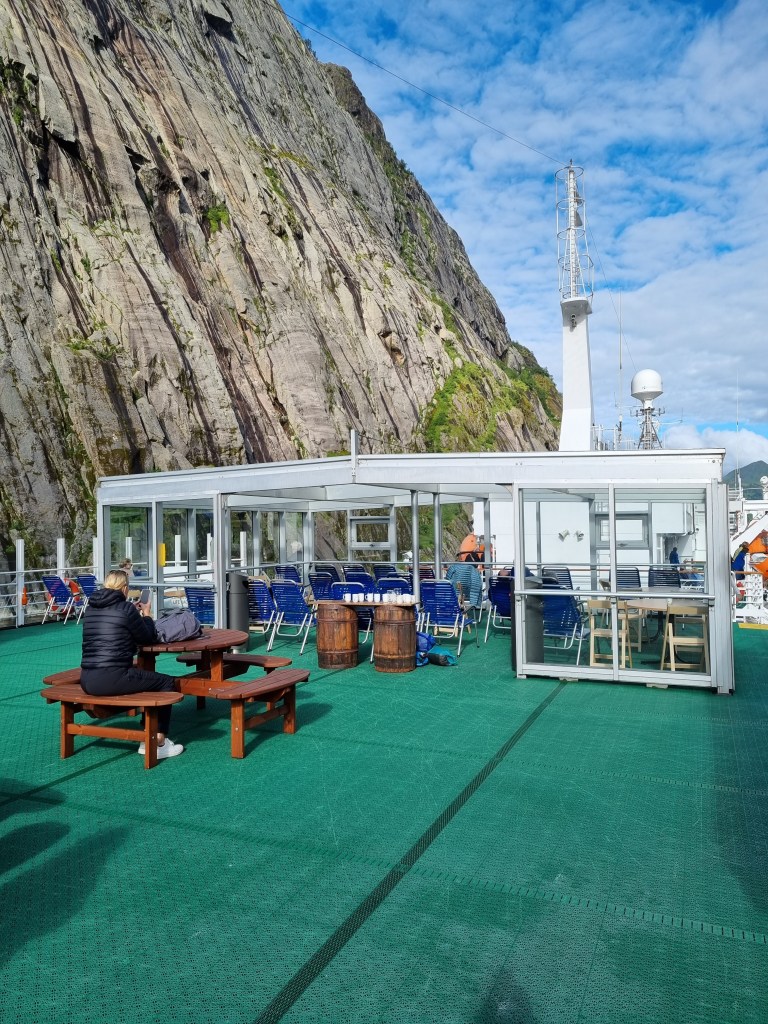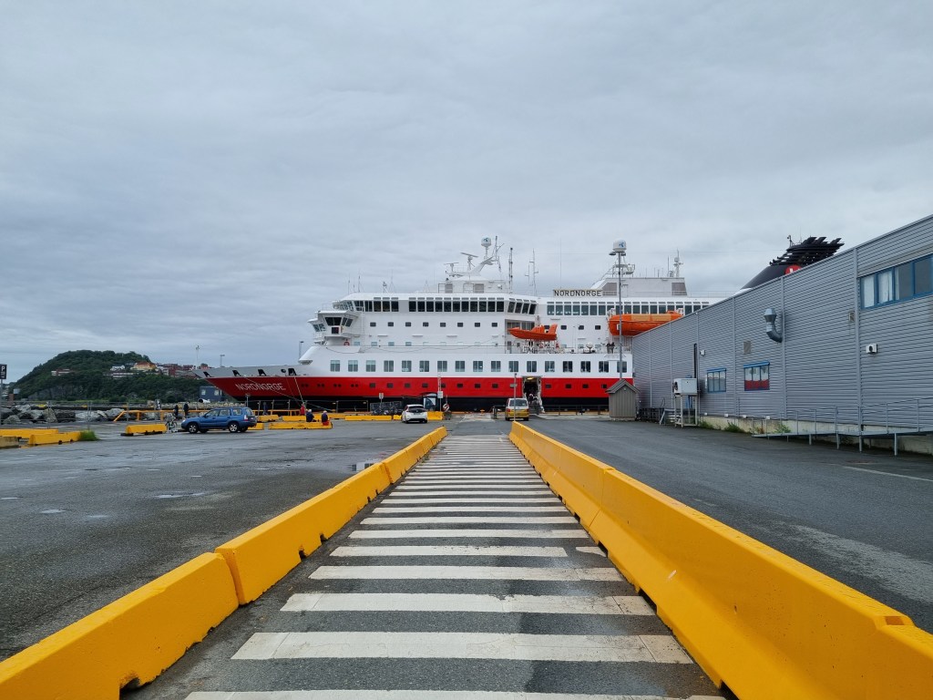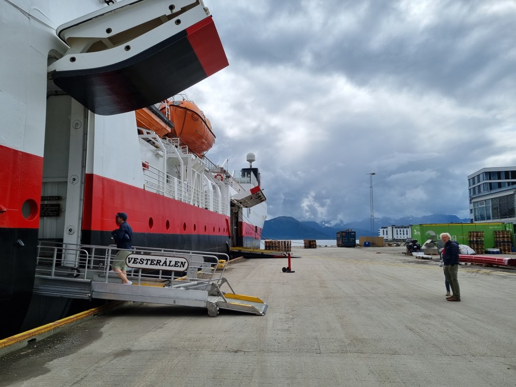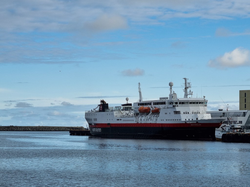 Här i Brönnöysund var det ett längre stopp. Vi gick till puben i närheten för öl och glass. Som ni ser är det två lastluckor öppna – en för gods och en längre förut för oss på två ben.
