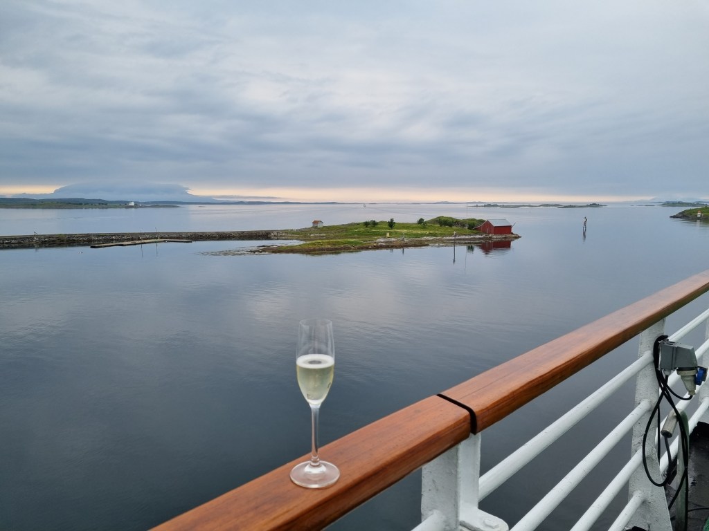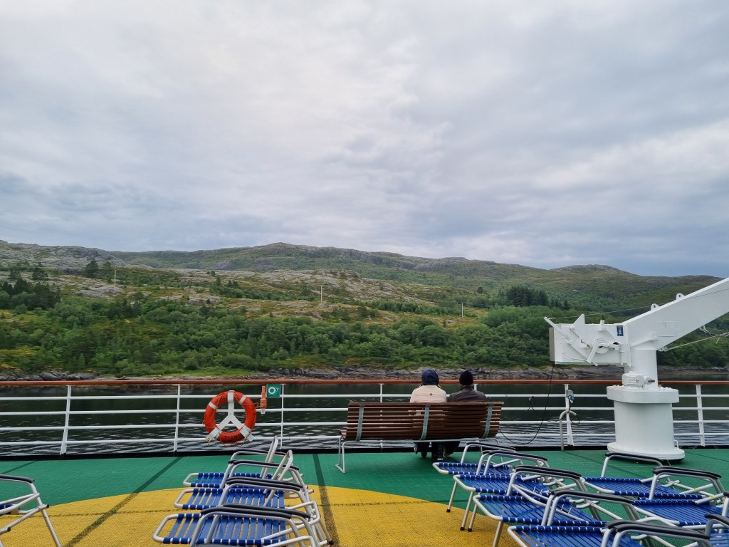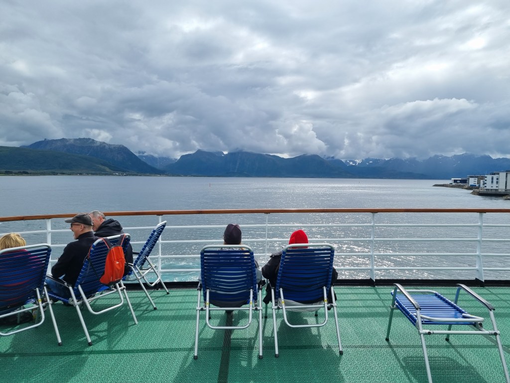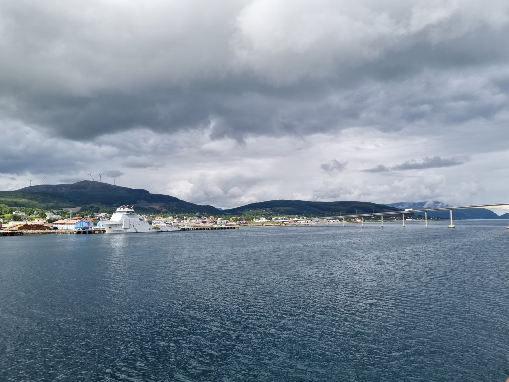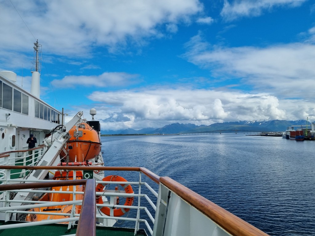 Här i Brönnöysund var det ett längre stopp. Vi gick till puben i närheten för öl och glass. Som ni ser är det två lastluckor öppna – en för gods och en längre förut för oss på två ben.