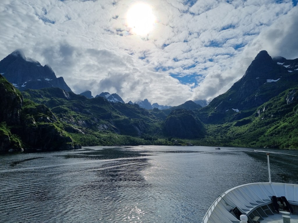 Frukostvyn är helt fantastisk. Här seglar vi faktiskt i området av platsen Vesterålen.