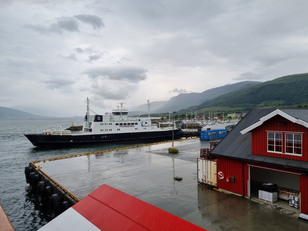 Trondenes anlöpte samtidigt som oss till Sandnessjöen. Här försökte jag hitta lunch på någon butik iland men det slutade med kafeterian ombord istället.