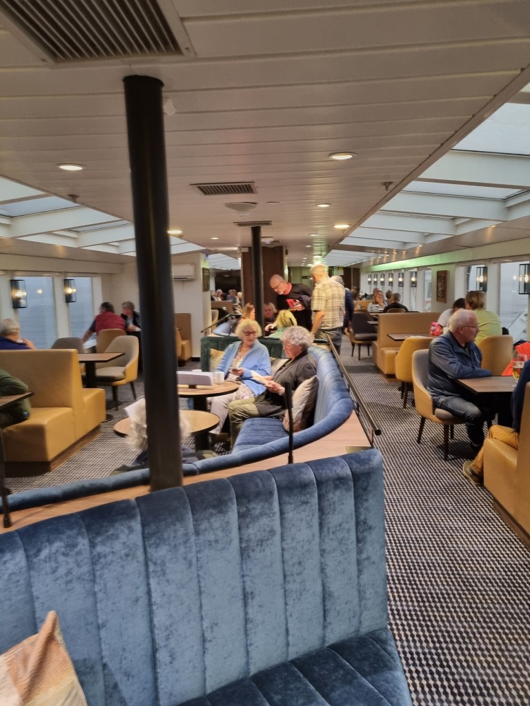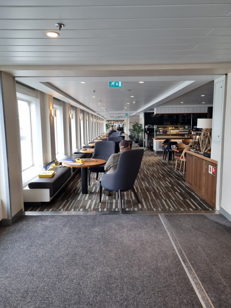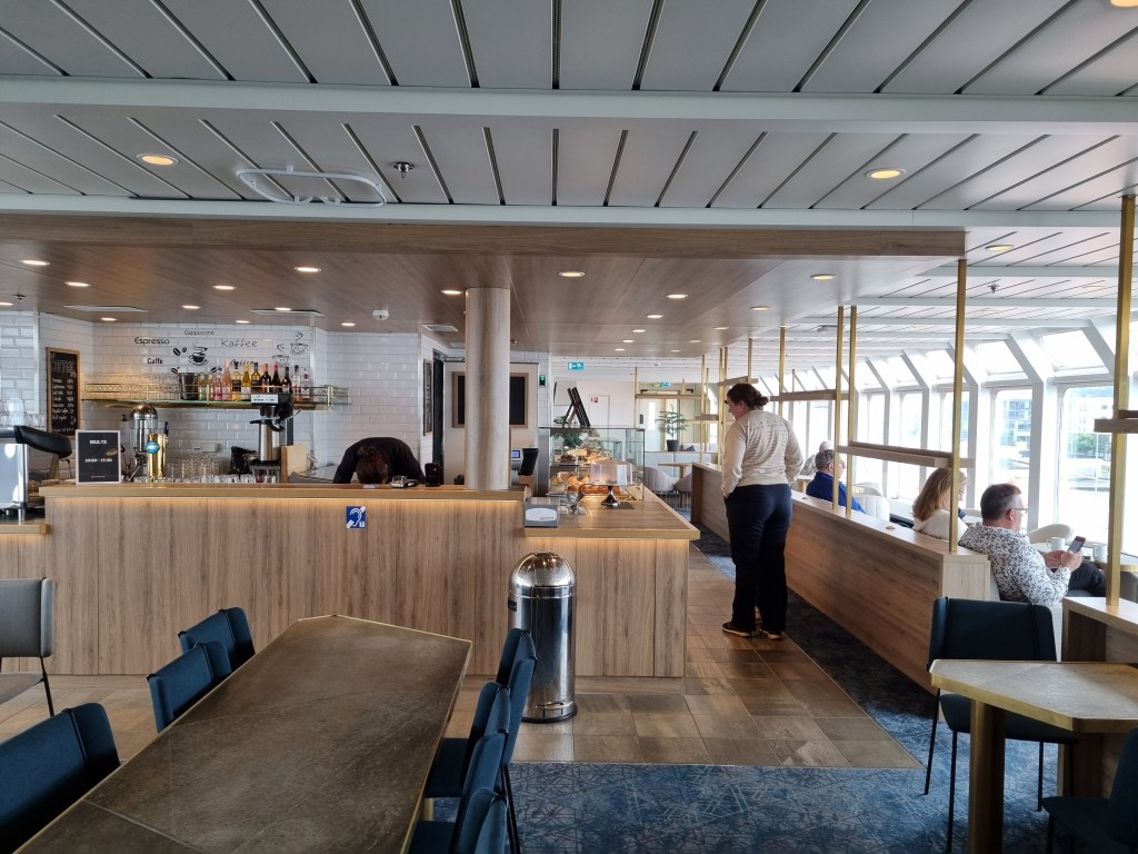 Kafeterian ombord. Här åt vi mat, drack öl och fikade. Ett alldeles utmärkt och gott utbud. Det fanns också måltidspaket som gick att förbeställa till den andra restaurangen, men där nöjde vi oss med frukost för full frihet kring tider och budget.