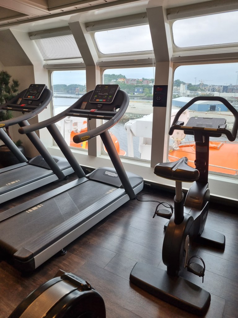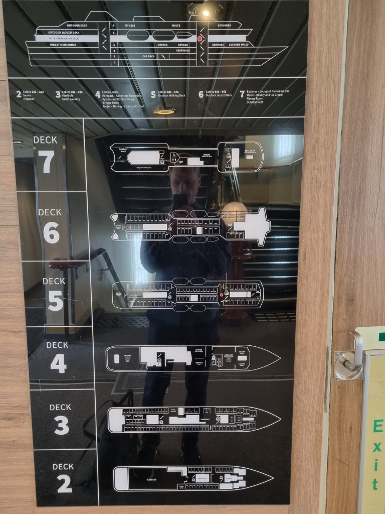 Hurtigrutens fartyg kan besökas vid kaj utan avgift. De ligger inne ganska många timmar i Trondheim. Resande gäster kan besöka byn, och en annan istället besöka fartyget. Kafeterian med fin-restaurangen bakom flaskkylen.