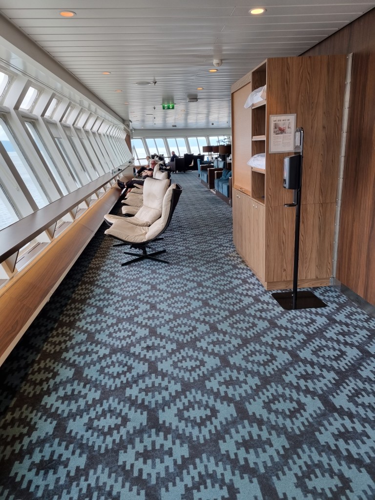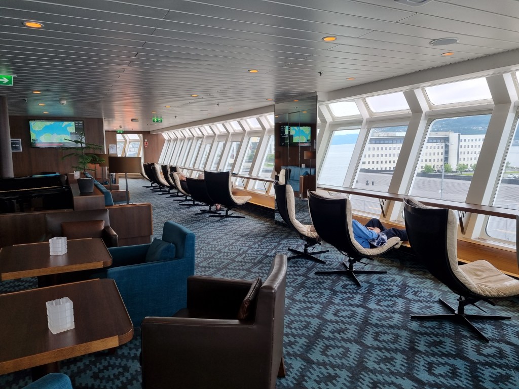 Den förliga utsiktssalongen. Det Vesterålen inte har i stora invändiga panoramasalonger, har de större fartygen hos Hurtigruten.