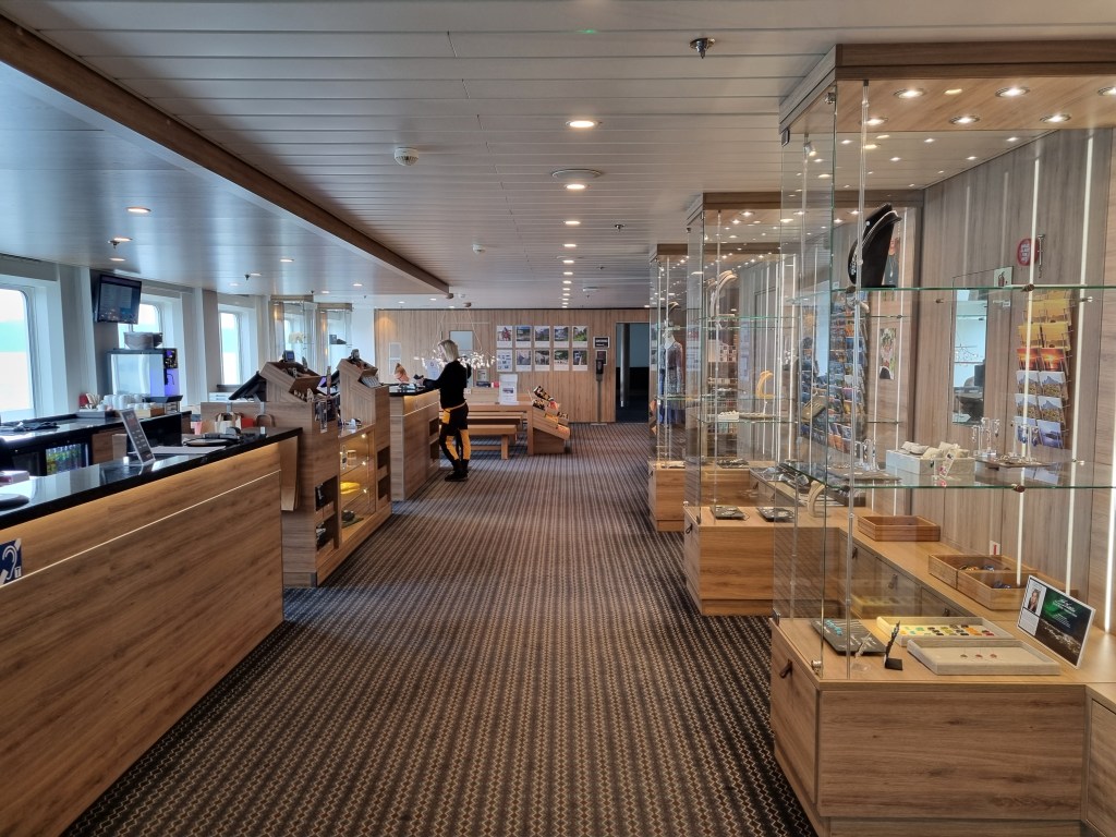En rymlig shop med allt möjligt du inte behöver och en och annan broschyr finns ombord. Det är möjligt att det fanns Toblerone och Famous Grouse, men nej, det var inte den vanliga färje-shoppen.