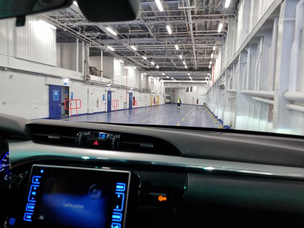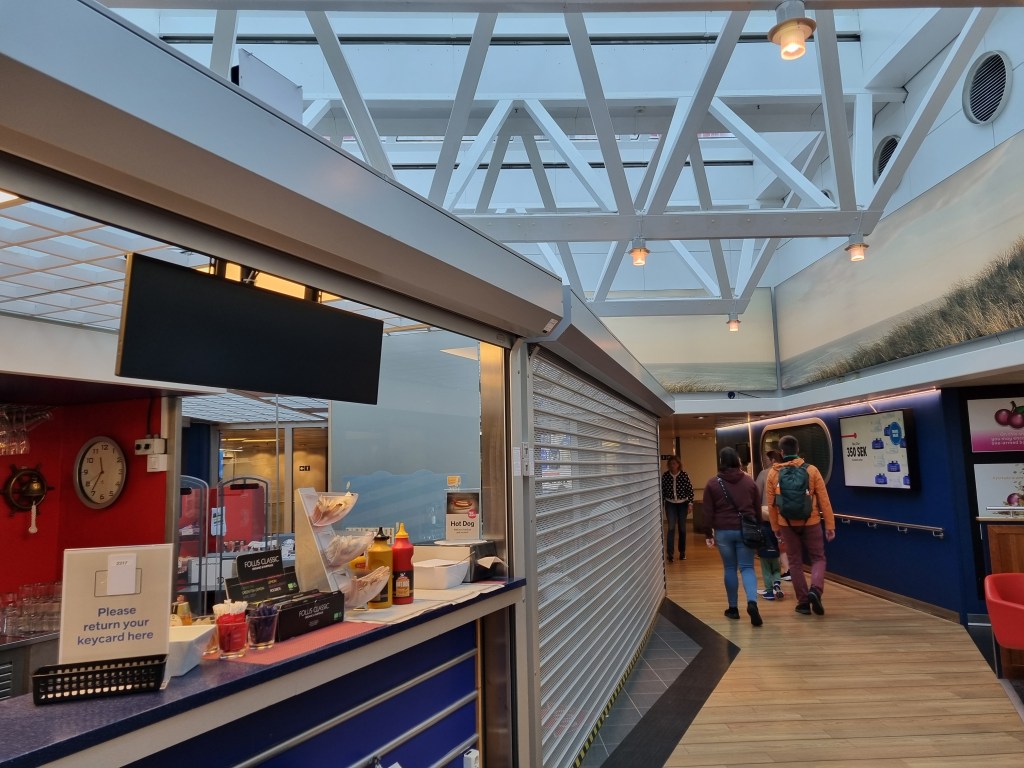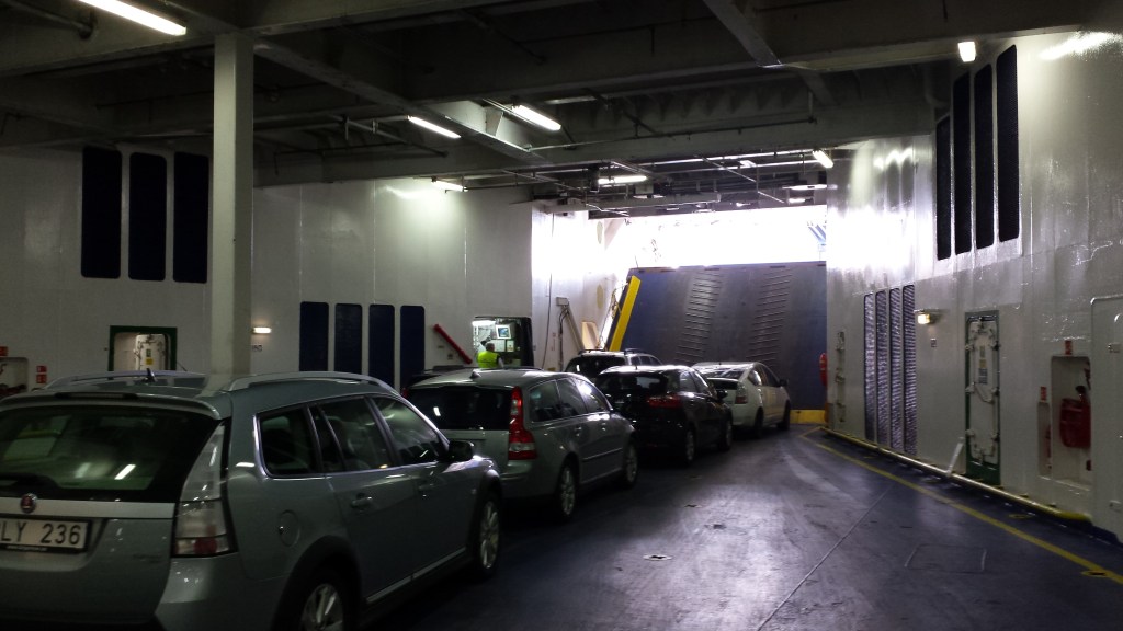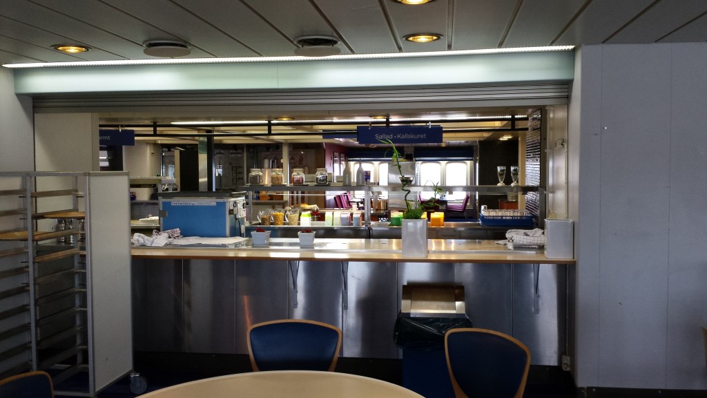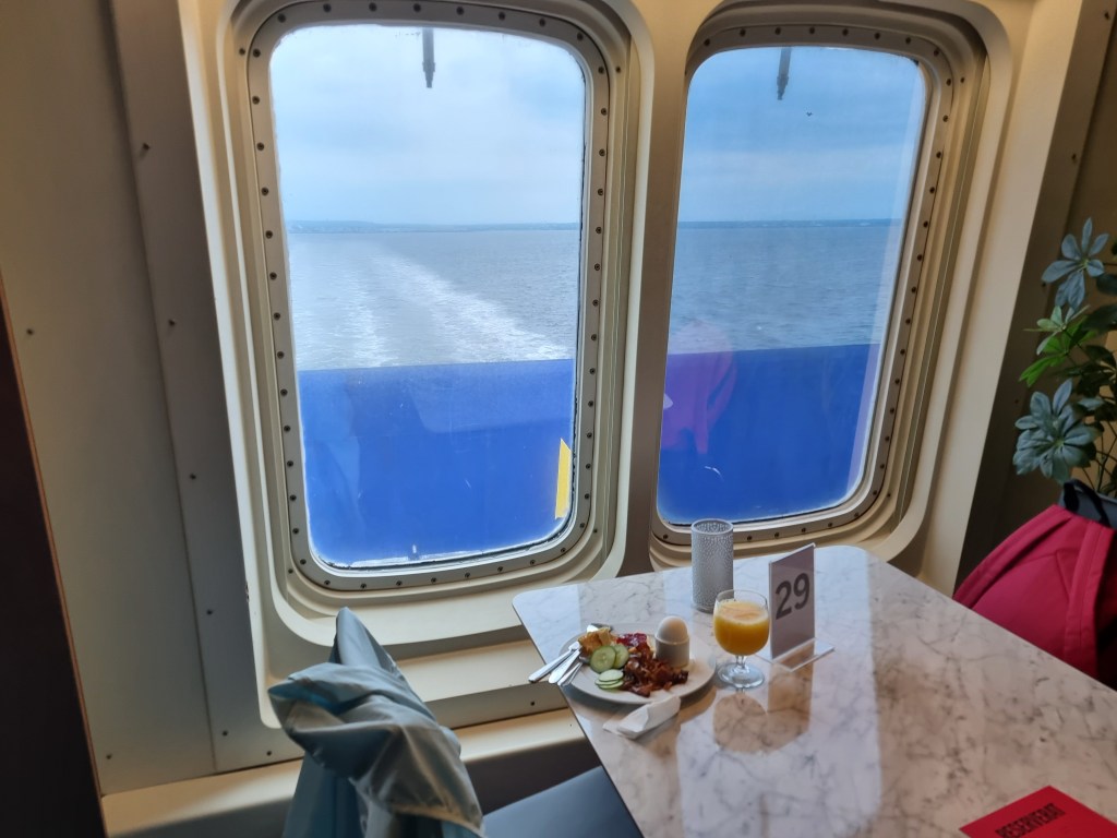 Det verkar vad ögat kan se en ganska stor andel husbilar på linjen. Första resan hade vi ätit frukost hemma, men nog lockade det när doften av stekt bacon nådde sinnena. Senaste resan var det tidigare uppstigning, och frukosten intogs ombord. Vi fick fönsterbord i aktern. Värt att hålla koll på är att de annonserade öppettiderna ombord och på webben inte innebär att maten står framdukad under den hela tiden, utan det gäller att vara snabb. Dock löste det sig fint ändå tack vare god service. Mot slutet gick personalen och kollade med alla gäster om de ville ha påtår.