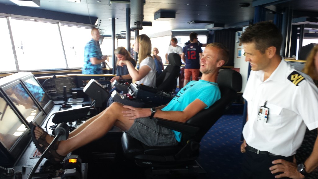 Tack vare kontakter kunde vi komma upp ett stort gäng på bryggan i samband med att vi var flera som fyllde 30 år under loppet av några månader. Styrman hade det lika roligt som vi under rundvisningen och pratstunden. Vi provade att sitta vid rodret i ”styrmansställning” och en spontan lätt gir mitt på havet visade sig vara en i sällskapet som getts tillgång till styrspaken. Var denne nykter? Nja, men riskfritt och preskriberat. Nedanför bryggan fanns en utomhus-jacuzzi. Solskydd och reflexioner gjorde det ibland svårt att se IN på bryggan, men UT gick lätt. Det tog en stund innan det kopulerande paret i poolen blev varse att 20 personer hade ögonen på dem…
