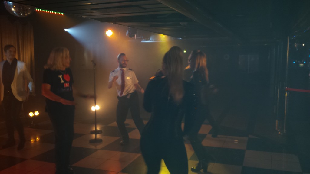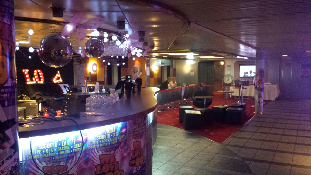 När allt annat var stängt på natten hade discot på däck 10 öppet under helgerna. Här uppe blev det aldrig riktigt rent och luktade konstant gammal öl och golvet var klibbigt. Inget som jag tänkte på under sena timmar, men det blev tydligt dagtid när resenärer som inte hade hytt låg däruppe och slappade. Från den stora balkongen bakom diskot, kunde man med trappor komma både uppåt och nedåt till de generöst tilltagna utedäcken. Inget trams som på andra färjor i och utanför koncernen att bomma igen bra utomhusutrymmen många turer, utan här hölls däcken öppna i allmänhet.